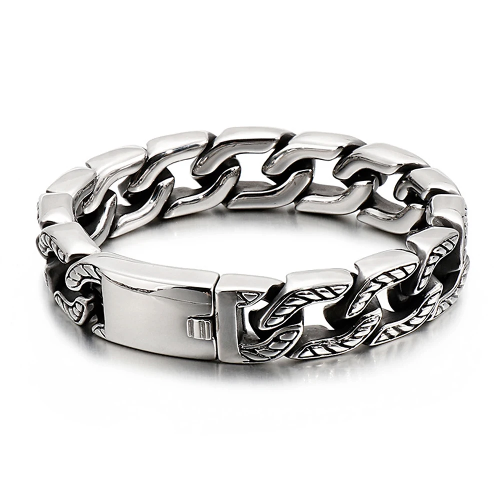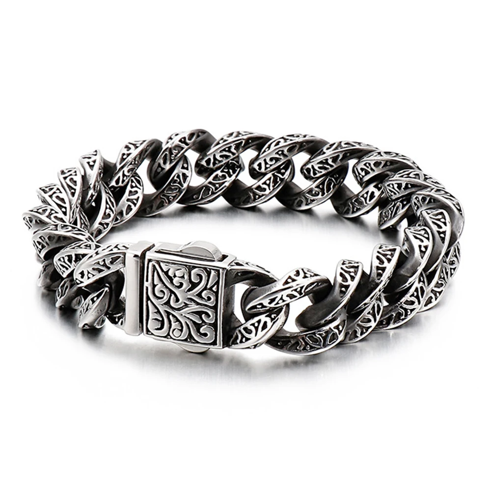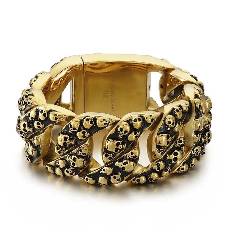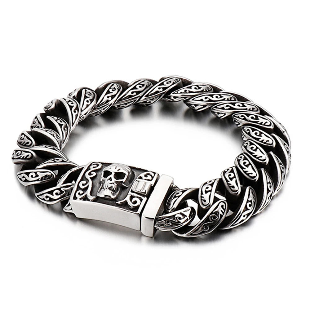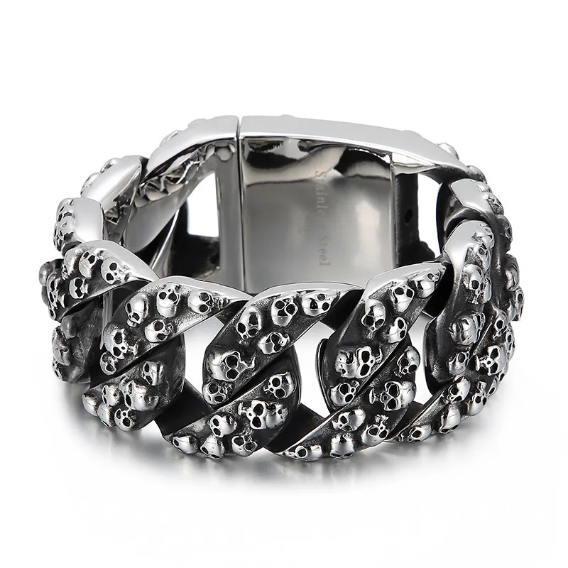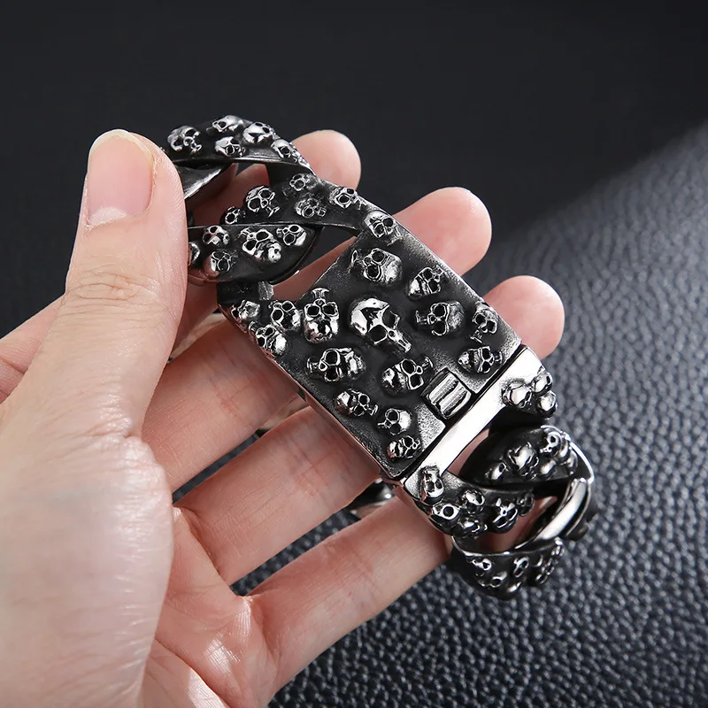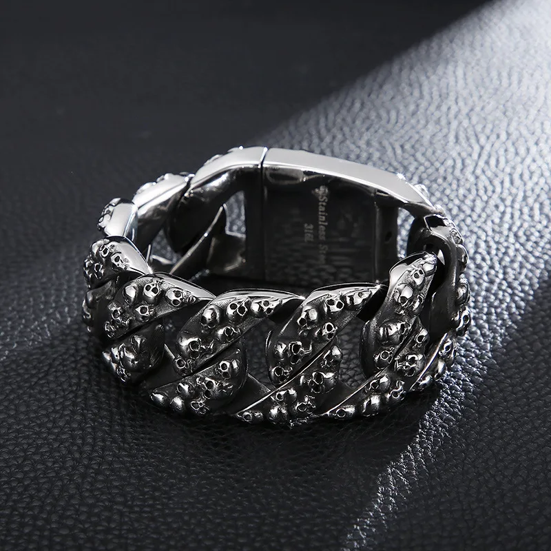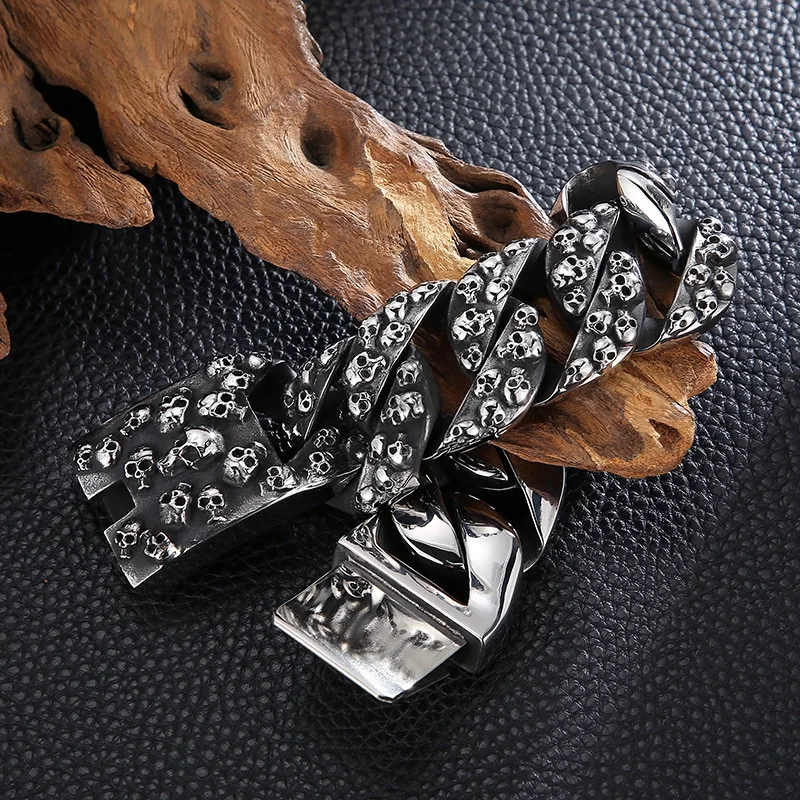 32mm Heavy Punk Retro Biker Bike Skull Bracelet Men Hiphop Rock Black Stainless Steel Chunky Curb Cuban Chain Bangle Jewelry