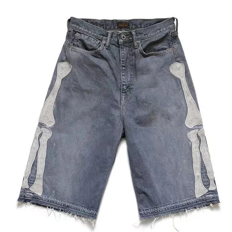KAPITAL Hirata Hohiro Loose Casual Pants Embroidered Bone Printed Washing Water Used Raw Denim Shorts for Men and Women