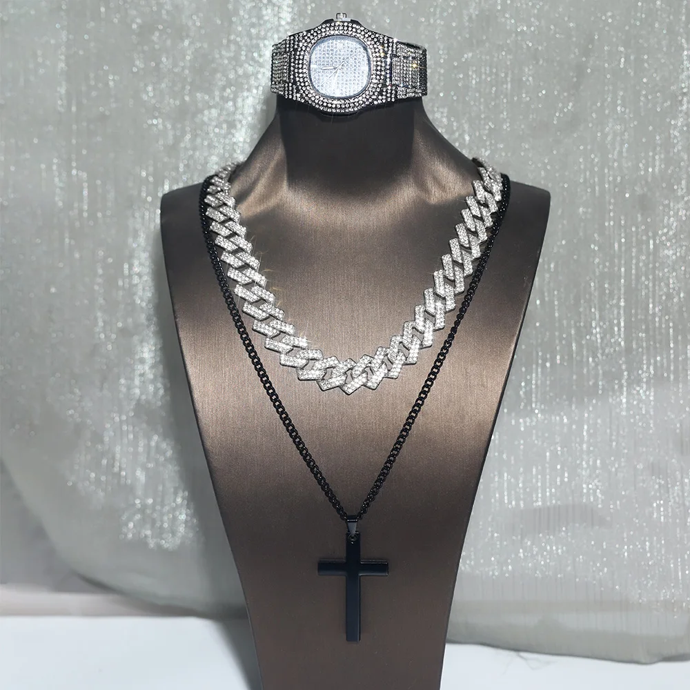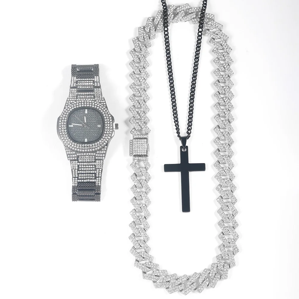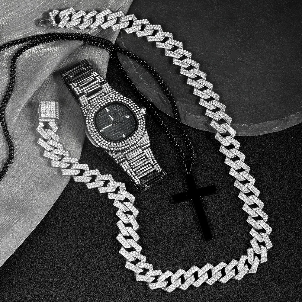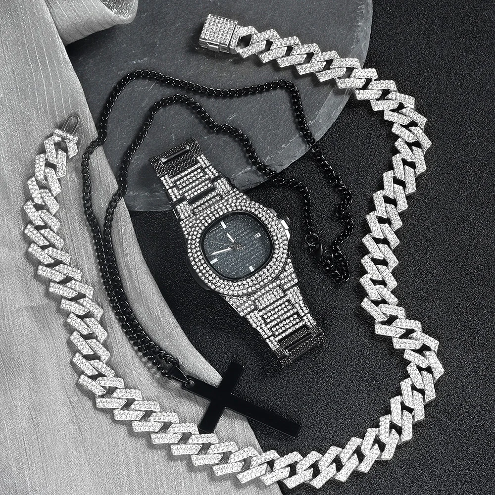 Men Black Watch Jewelry Set Hip-hop Punk Iced Out Cuban Chain+Stainless Steel Cross Pendant Necklace Stylish Men Women Gift Set