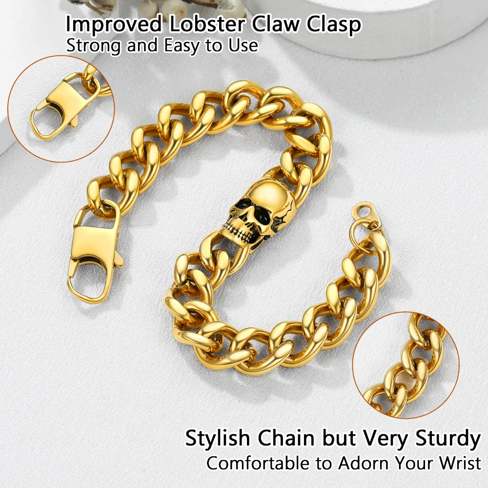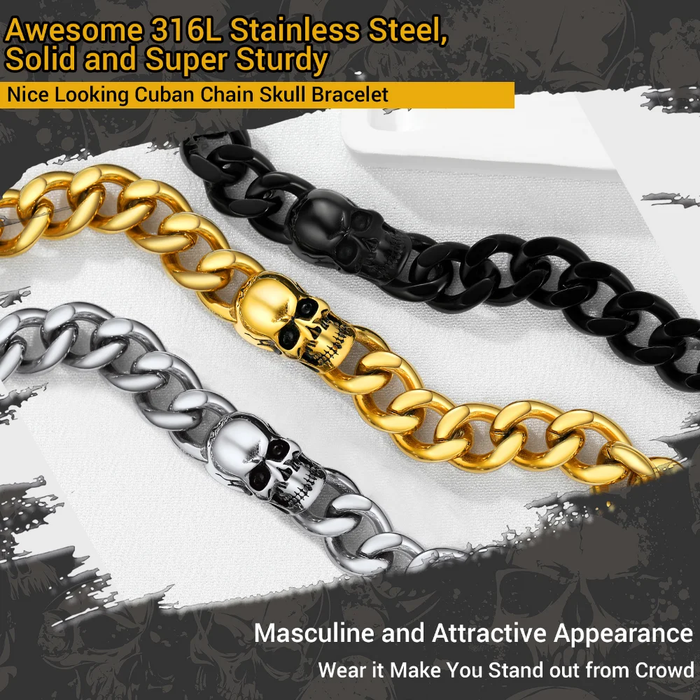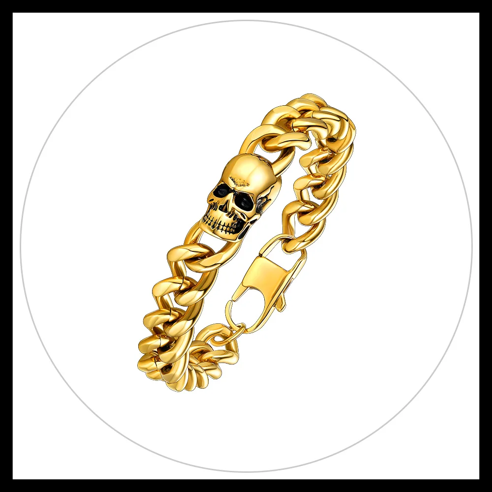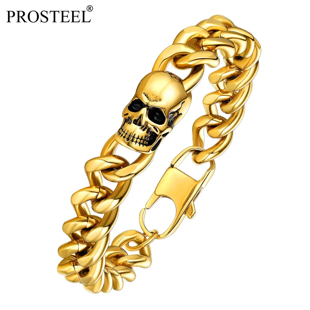 Prosteel 14K Gold Plated Skull Head Bracelets for Men Stainless Steel Black Plated Goth Cuban Chain Bracelet Fahion Jewelry Gift