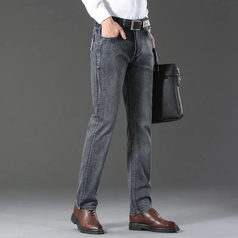 Spring Autumn Gray Blue Male Trousers Men’s Office Casual Jeans Classic Solid Straight Elasticity Denim Pants Breathable Jeans