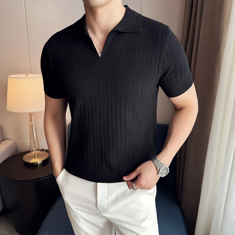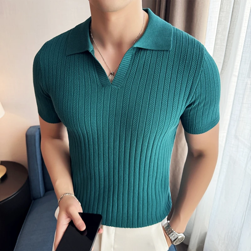 Summer Striped V-neck Knitted Polo Shirts Men‘s Short Sleeved T-shirt Thin Breathable Casual Business Polo Shirt Men Clothing